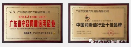 車賢士潤滑油自品牌成立以來,非常重視產品質量提升和品牌建設,產品質量是品牌建設的基石,品牌建設助推產品形象提升,凝聚起企業價值觀和消費者對產品的認可。目前,車賢士品牌潤滑油,已獲得了“廣東省守合同重信用企業”、“中國潤滑油十佳品牌”、“中國節能環保產品”、“質量信得過產品”、“中國高新技術企業”、“ISO 9001認證企業”等多項榮譽。